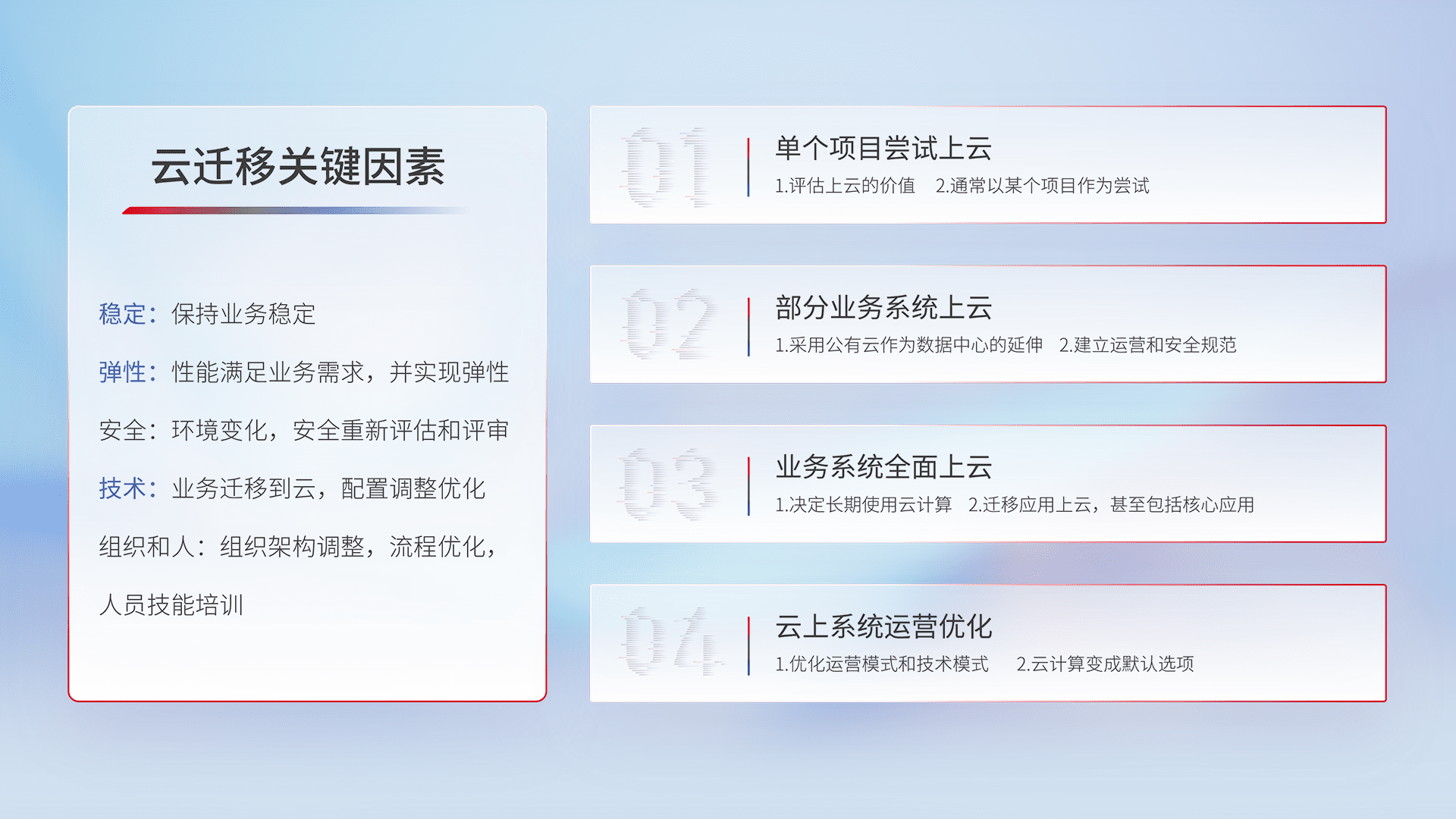结合实际业务,,从规划设计、、云平台选型、、、、云原生改造、、数据迁移、、、、集成交付,,,,迁移全过程为客户识别最佳上云路径,,,做好风险识别管理,,,,设计网络架构、、、、身份权限、、、安全审计合规、、、、操作审计、、、、日志审计、、、监控告警策略、、多站点容灾设计等,,,对云上基础设施进行整体规划,,,提升IT治理水平,,以满足弹性、、、、高可用、、、高性能的需求。。