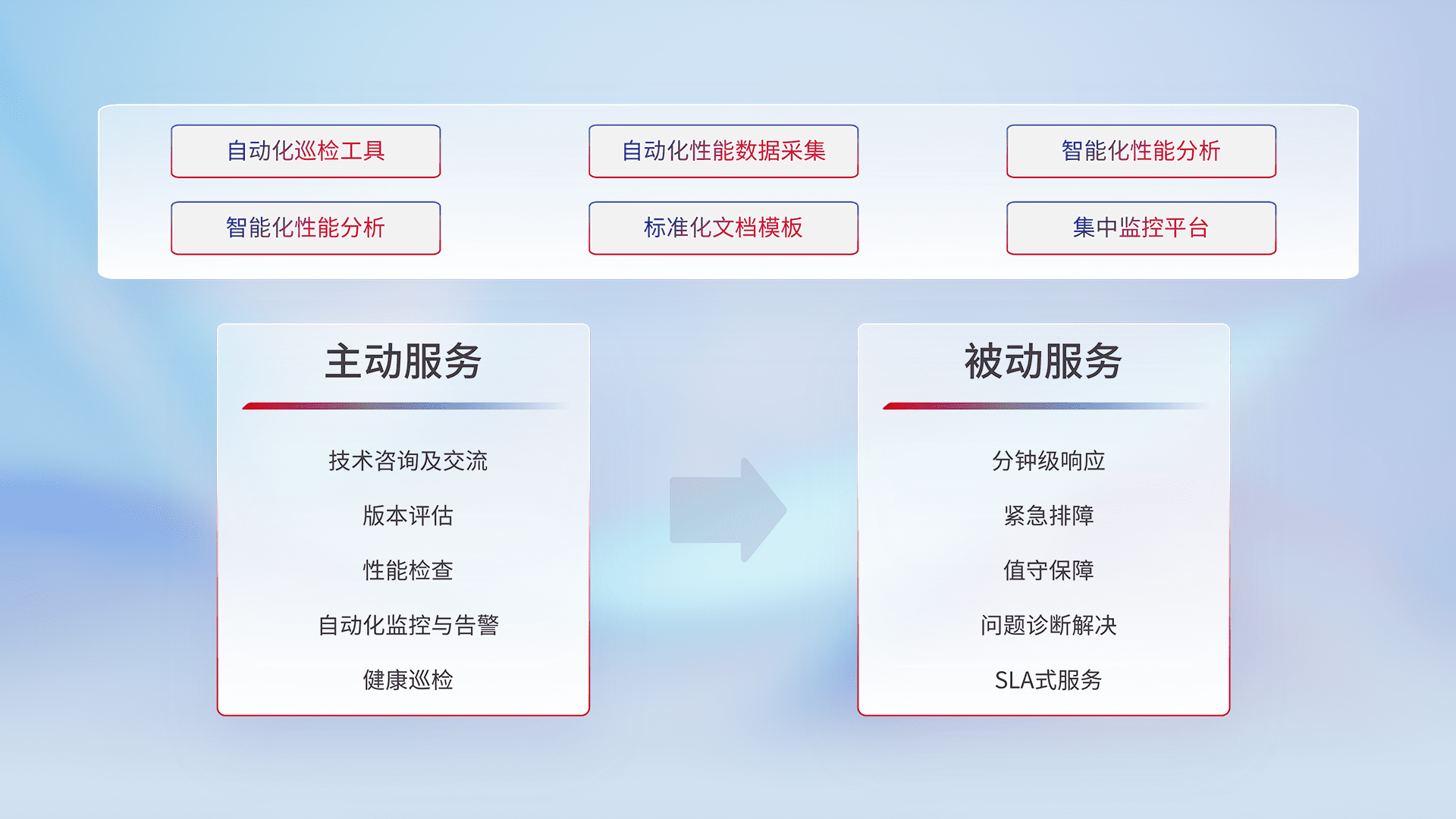 智能化工具和标准化文档,,,,保障服务质量,,,提供主动服务(包含技术咨询、、版本评估、、性能检查、、、自动化监控与告警、、、、健康巡检)和被动服务包含(分钟级响应、、、紧急排障、、、、值守保障、、问题诊断解决、、、、SLA服务)。。